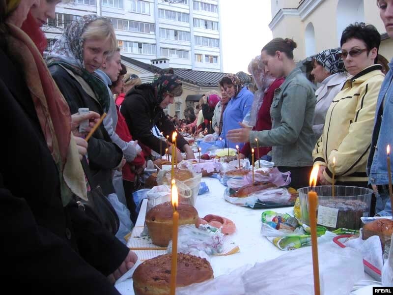 У менскай катэдральнай царкве шматлюдна было цягам усяе ночы, а таксама ўранку і днём. Людзі моляцца, ставяць сьвечкі, асьвячаюць велікодныя стравы. Многія ня здолелі патрапіць у будынак царквы і застаюцца на вуліцы. Гутару зь людзьмі: