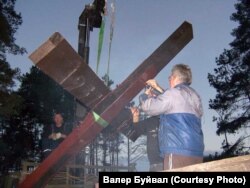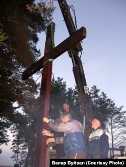 На фота – устанляваньне рэстаўраванага Крыжа Пакуты. На жаль, здымак кампазыцыйна загрувашчаны і з тэхнічнымі недахопамі. Але аўтар здымаў, як умеў, і фіксацыя падзеі тут ёсьць.