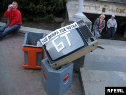 Яны паставілі перад кінатэатрам вялізную скрыню з надпісам “БТ”, кожны заляпіў рот кавалкам газэты “Советская Белоруссия". Такім чынам яны выказалі пратэст супраць ілжы ў дзяржаўных газэтах і тэлебачаньні.