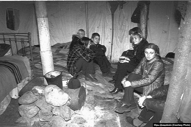 На фота №48 сфатаграфаваны нутраны выгляд палаткі, у якой дзяжурылі маладыя людзі. Тут жа зьнятыя і самы энтузіясты.
