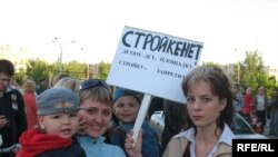 Адна з удзельніц мітынгу трымала плякат “Будоўлі – не!Дзецям – дзіцячую пляцоўку, будаўніцтва забараніць!” За мітынгам назіралі некалькі міліцыянтаў, аднак яны ніяк не перашкаджалі і адварочваліся ад фотакамэры.