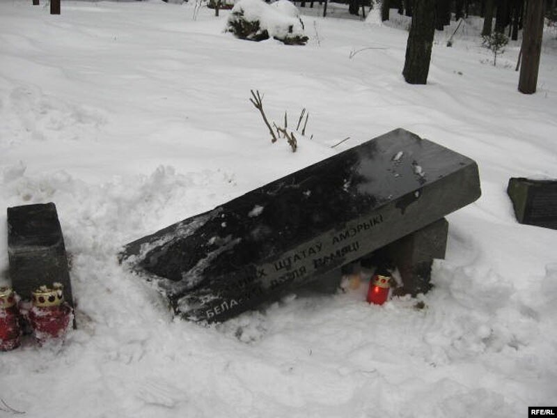 Сем здымкаў пра вандалізм у Курапатах ахвяравала нам спадарыня Ганна Соўсь. Мы паказваем тут тры характэрныя фатаграфіі. На здымку 128 сябры КХП БНФ ачышчаюць апаганены вандаламі помнік у памяць расстраляных габрэяў за часы сталінскага камуністычнага тэрору.