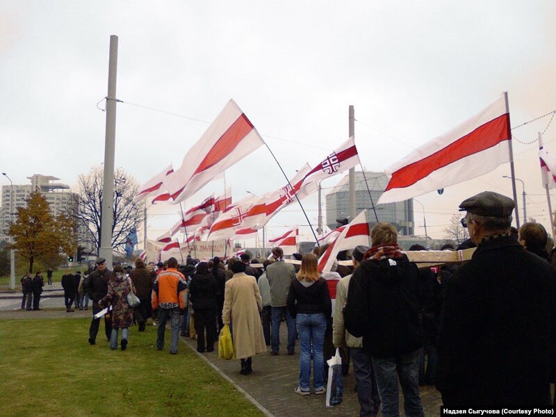 Над людзьмі сьціплы і адзіны плякацік, на якім напісана: “Не забудзем! Не даруем!” Усё надзвычайна гарманічна і па сэнсу, і па выяве. Тут вельмі глыбокі зьмест. Нельга забыць, бо перастанем быць людзьмі. І нельга дараваць злачынцам. Бо калі зло не караць, яно робіцца нормай. Ёсьць над чым задумацца цяперашнім людзям, што бачаць, як вяртаюцца цені мінулага.