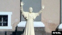 Ксёндз Мікалай Ліпскі: “ Гэты помнік мы паставілі з нагоды візыту кардынала Бэртонэ, сакратара Ватыкану. Хацелі, каб ён сам прыехаў асьвянціць гэты помнік, але не атрымалася – у яго дужа насычаны плян візыту. Гэта першы ў сьвеце помнік Папу Рымскаму. Я сам яго фундую. А рабілі помнік у Менску -- скульптар, прафэсар Леў Аганаў. Ён зроблены з цэменту, фігура ў чалавечы рост, 1 мэтр 70 сантыметраў, у белай сутане, з такім жэстам блаславеньня. Стаіць на пастамэнце, каля касьцёлу, перад самым уваходам” -- распавядае ксёндз Мікалай.