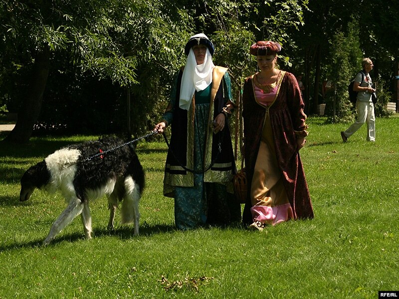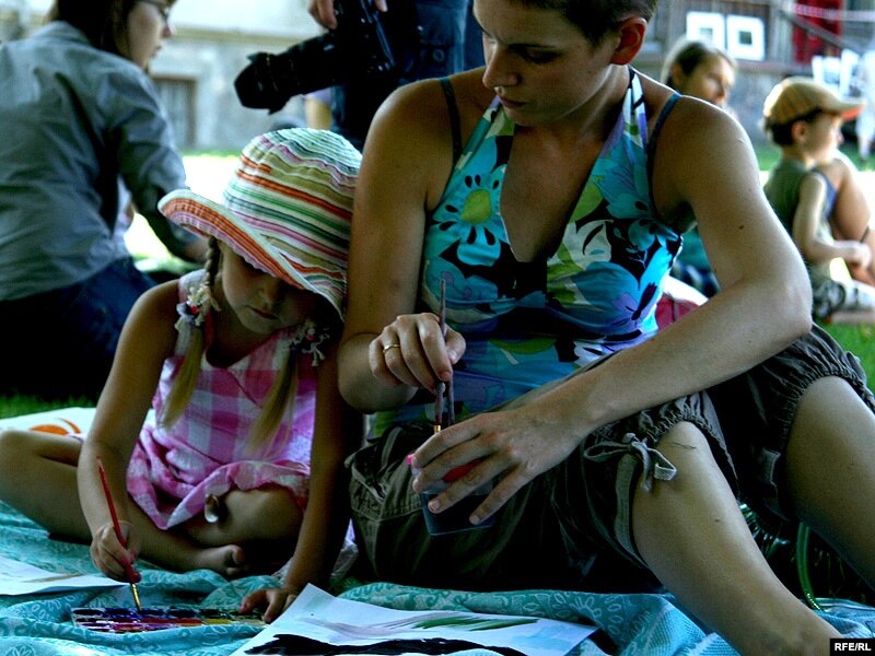Крыху воддаль юных мастакоў некалькі кабетаў гулялі па прысадах у сярэднявечных строях. І гэта была іх форма пратэсту супраць плянаў разбурэньня старасьвеччыны ў Лошыцы. Выкладчыца Ларыса Козак: