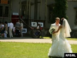 Краявіды з адпачывальніцамі ў старадаўніх сукенках аздаблялі шлюбныя строі некалькіх параў, якія сёньня абралі Лошыцкі парк за месца сваіх вясельляў.
