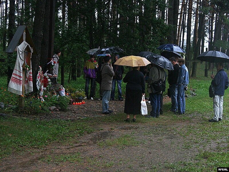 Быў вельмі моцны дождж, неба так вельмі моцна плакала... Мы сабраліся, запалілі сьвечкі, не падняліся да галоўнага мэмарыялу, бо быў вельмі моцны лівень, але сталі каля вялікага крыжа, пастаялі, успомнілі, сп.Сіўчык сказаў слова, а таксама сказаў сп.Парсюкевіч".