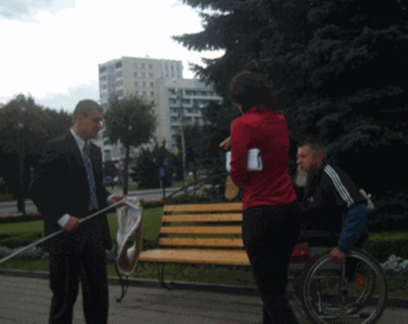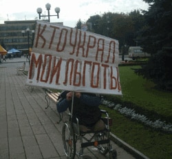 На плякатах, усталяваных ім, зьмешчаныя запісы “Ганьба лукавым льготам!” і “Хто скраў мае льготы”. Мінакі падыходзілі да інваліда-вазочніка і выказвалі яму сваё спачуваньне.