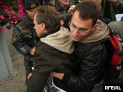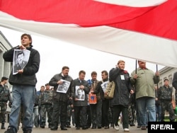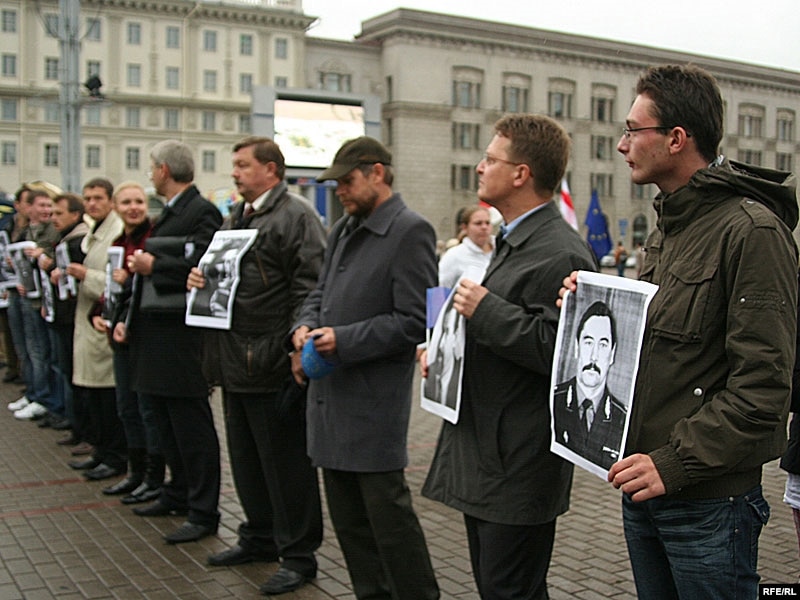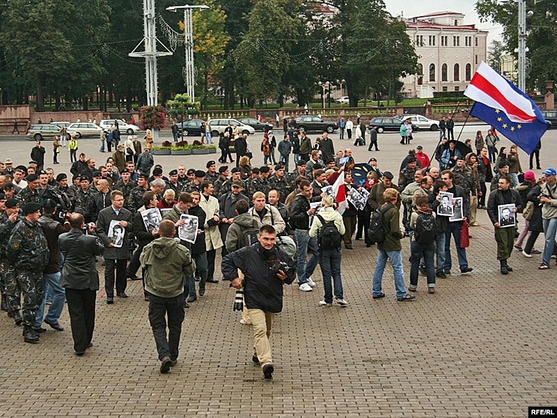 На гэты момант людзі сыходзяць з плошчы, іх вядуць спэцназаўцы, якія зрабілі жывы ланцуг і выціскаюць удзельнікаў акцыі з плошчы. Сярод прысутных - Лявон Баршчэўскі, Анатоль Лябедзька, Сяргей Калякін. Людзі нясуць партрэты зьніклых. Сюды прыйшла і Вольга Казуліна, Алег Волчак, некалькі асуджаных у “справе 14-ці” - акцыя ладзіцца і на знак салідарнасьці зь імі.