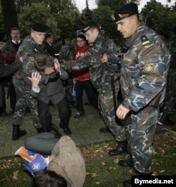 Адразу пасьля гэтага людзі пачалі ствараць ланцуг і першая сутычка - ужо ня першы раз - адбылася з Анатолем Лябедзькам. Спэцназаўцы накінуліся на яго і пачалі штурхаць, выдаляючы яго з плошчы.