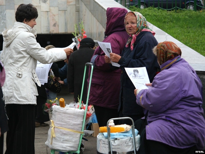 Разам з даверанымі асобамі спадарыня Гразнова таксама раздае ўлёткі каля ўваходу на станцыю мэтро “Трактарны завод”: