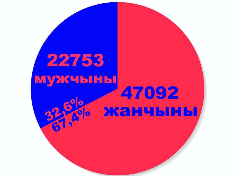 Сярод іх 47.092 жанчыны (67,4%) і 22.753 мужчыны (32,6%). Зь іх старэйшыя за 30 гадоў – 61.872 (88,6%) чалавекі, а маладзейшых за 30 — усяго 7.973 (11,4%).
