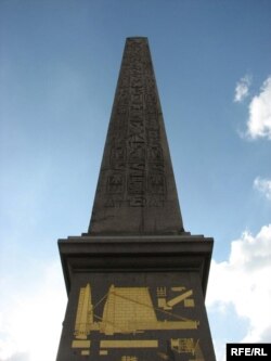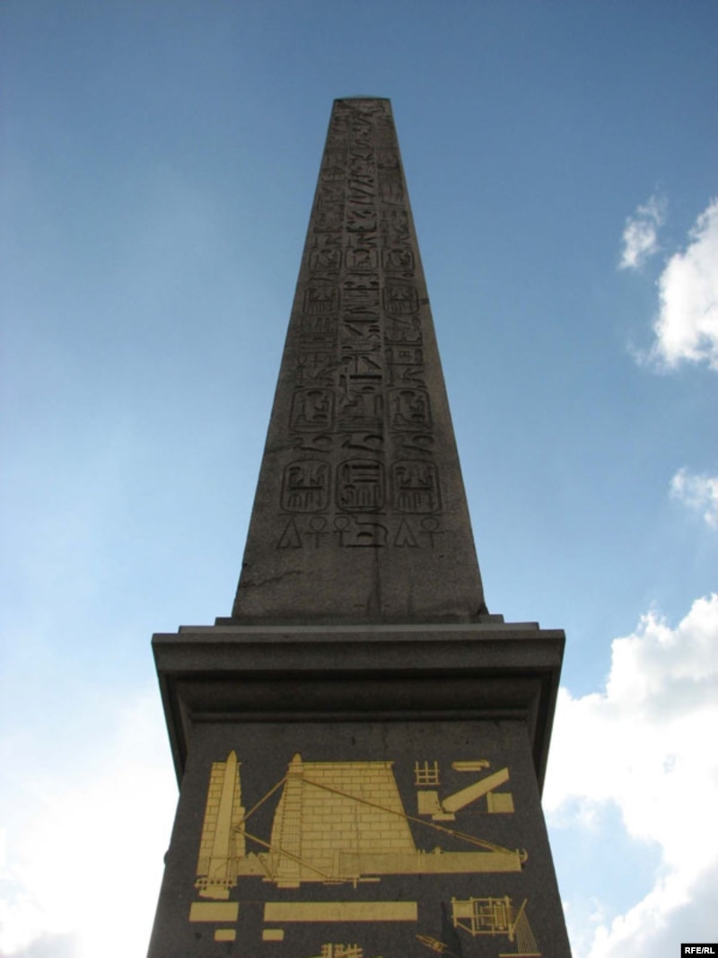 Абэліск на Пляцы Згоды зь ерогліфамі пра славу Рамзэса Другога