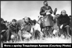Зянон Пазьняк: Сябры, я зачытаю вам дэклярацыю таварыства "Мартыралёг", створанага для высьвятленьня злачынстваў сталіншчыны і высьвятленьня нашых стратаў, усіх загінуўшых у 20-я, 30-я, 40-я, 50-я гады ў час сталінскага тэрору. Вы бачыце, што нашая прэса друкуе толькі аднабаковую інфармацыю тых людзей, якія выступаюць супраць перабудовы, і тое, што мы тут вымушаныя сабрацца за горадам у полі, сьведчыць аб іхняй пазыцыі.