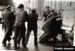 Людзі: Нікуды не пойдзем. Сядзем! Ўсе селі... Сядзім, мы нічога ня робім дрэннага...