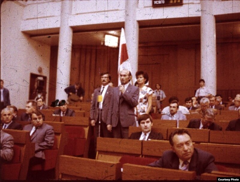 Пачатак нечарговай сэсіі Вярхоўнага Савету 12 скліканьня, на якой была абвешчана незалежнасьць Беларусі, 24 жніўня 1991 г. (са сьцягам – Валянцін Голубеў, Зянон Пазьняк, Вольга Галубовіч).