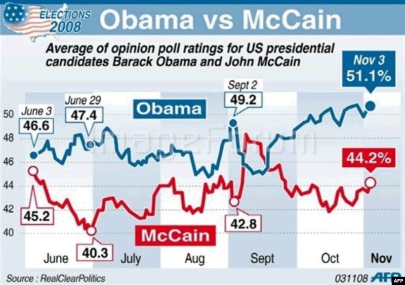 Амаль усе апытаньні грамадзкай думкі паказваюць, што кандыдата ад Дэмакратычнай партыі Барак Абама захоўвае перавагу над сваім рэспубліканскім супернікам Джонам Маккейнам.