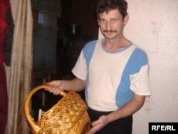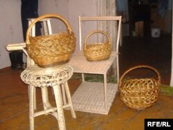 Але я ня зьехаў з Калодчына з пустымі рукамі. Тут жыве адзін з найлепшых майстроў лазапляценьня, Сяргей. Ягоная хата — своеасаблівы музэй прыкладнога мастацтва. Тут ёсьць з лазы і кошыкі, і крэслы, і дыванкі, і сталы, і нават афіцыянцкі столік на колцах.