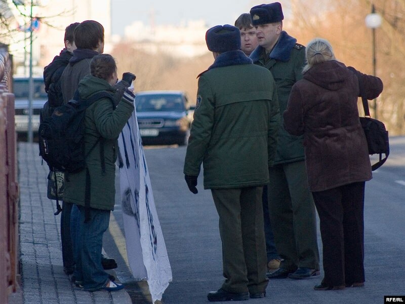 Да іх выйшлі ахоўнікі. На патрабаваньне спыніць пікет, маладафронтаўцы адказалі, што яны маюць права выказваць сваё меркаваньне.