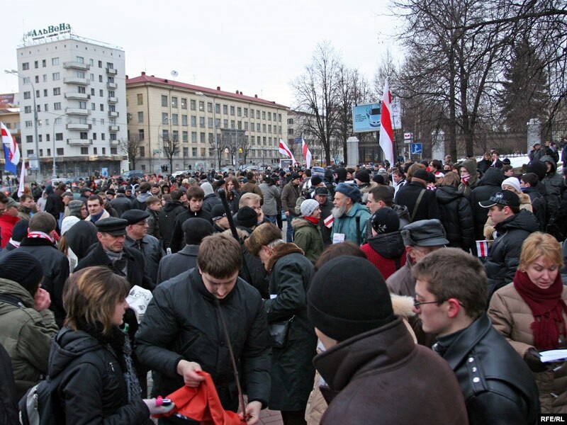 18.52 Старшыня Партыі БНФ Лявон Баршчэўскі ў інтэрвію Радыё Свабода заявіў: Я спадзяюся, што беларусы ўмеюць годна сьвяткаваць сваё галоўнае нацыянальнае сьвята і што сёньняшні Дзень Волі не закончыцца чыёй-небудзь няволяй. Гэтага я, як арганізатар, жадаю ўсім і самому сабе. Народу тут шмат, я бачу вельмі шмат твараў, якіх я ніколі раней не сустракаў. Гэта азначае, што да нас далучаюцца новыя людзі, шмат моладзі. Што датычыць фармату сёньняшняй акцыі, дык гэта будзе віншаваньне вядомых у Беларусі людзей і палітычных асоб тут, ля Акадэміі Навук. А потым мы плянуем зрабіць інтэрпрэтацыю Ланцуга Свабоды.