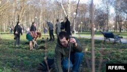Актывісты “Моладзі БНФ” саджалі дрэвы ля чарнобыльскай капліцы на вуліцы Карастаянавай.