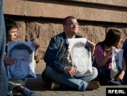 Прыкладна тры дзясяткі ўдзельнікаў акцыі салідарнасьці, трымаючы партрэты Мікалая Аўтуховіча, падышлі пад урадавую трыбуну на Кастрычніцкай плошчы. Калі да іх падышлі байцы спэцназу, яны селі на асфальт. Яны скандавалі: "Свабоду палітвязьням!"