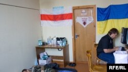 Ва ўправе галадоўнікам выдзелены невялікі пакойчык, мы падлічылі так дакладна - мэтраў 14-ць. У пакоі вісяць бел-чырвона-белы сьцяг і ўкраінскі, партрэты палітвязьняў, расьцяжка "Галадоўка", эмблема "Маладога фронту", партрэты, тры кампутары, некалькі спальнікаў.