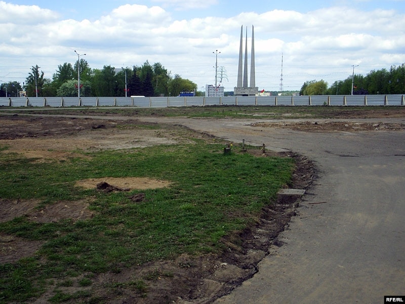 Старшыня аблвыканкаму Аляксандар Косінец распарадзіўся, каб Плошча Перамогі сталася цэнтральнай плошчай гораду. Таму яе вырашана замасьціць пліткай, выкарчаваўшы ўсе дрэвы – у тым ліку 50-гадовыя канадзкія елкі, крымскія ружы, плакучыя арабіны ды іншыя рэдкія расьліны, якія ў 1974 годзе прывозілі сюды з усяго былога Савецкага Саюзу.