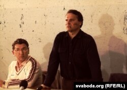 Сяргей Антончык выступае на паяджэньні страйкаму. Зьлева -- Алесь Галькевіч. 1991 г. Выкадроўка з кінастужкі.