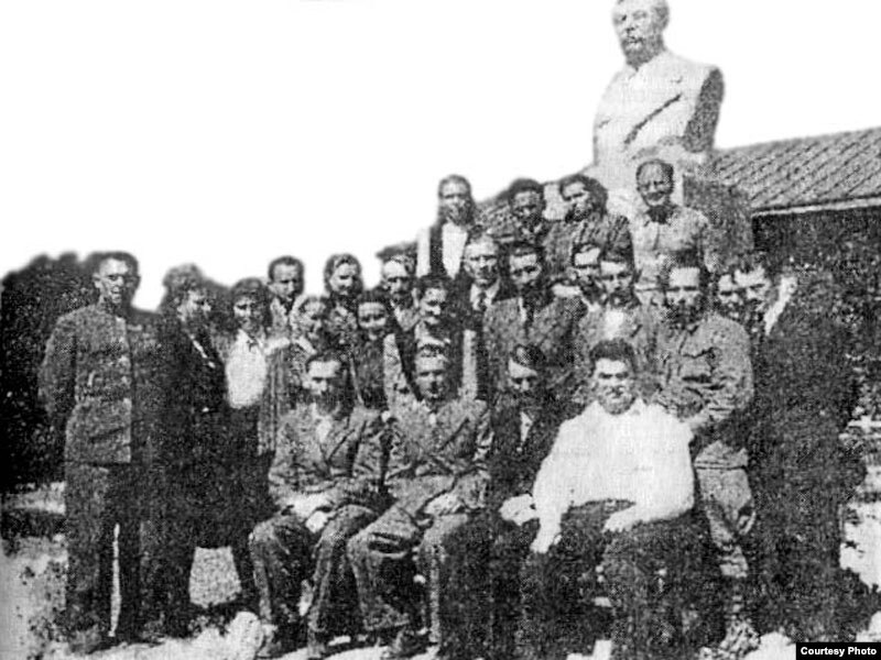 Група работнікаў у бюста І.Сталіна. Фота з кнігі