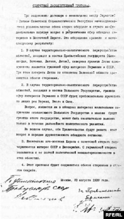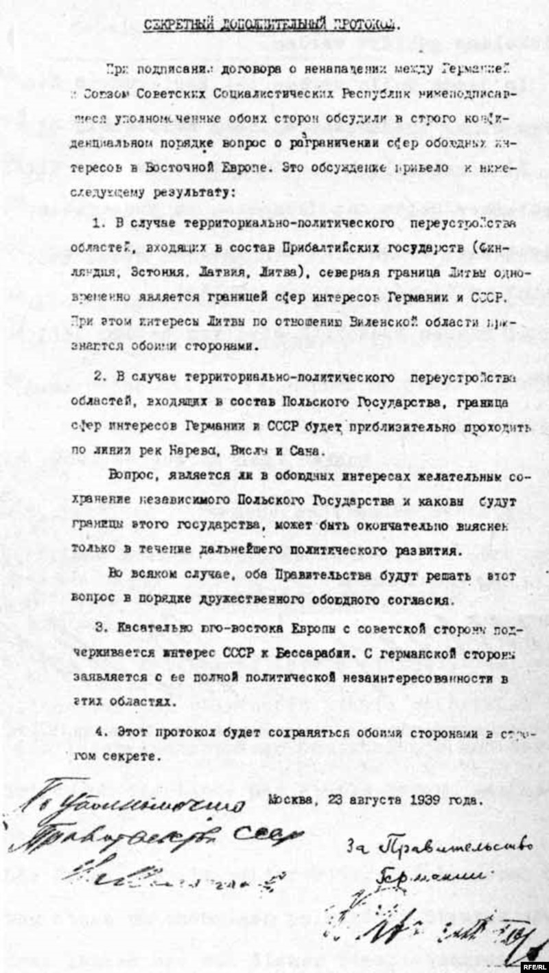 Існаваньне сакрэтнага пратаколу да дамовы аб ненападзе паміж Нямеччынай і Савецкім Саюзам доўгі час адмаўлялася савецкім бокам. Толькі пры канцы 1980-х гадоў гэты факт быў прызнаны і вядомы грамадзкасьці. У сакрэтным пратаколе было 2 артыкулы, якія і вызначылі разьвіцьцё падзеяў, распавёў гісторык Ігар Кузьняцоў: