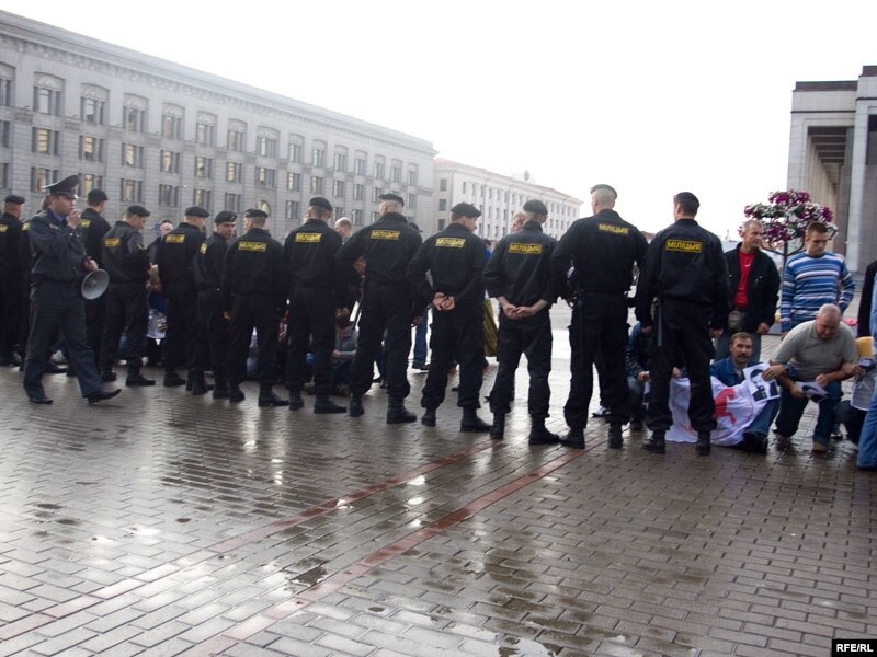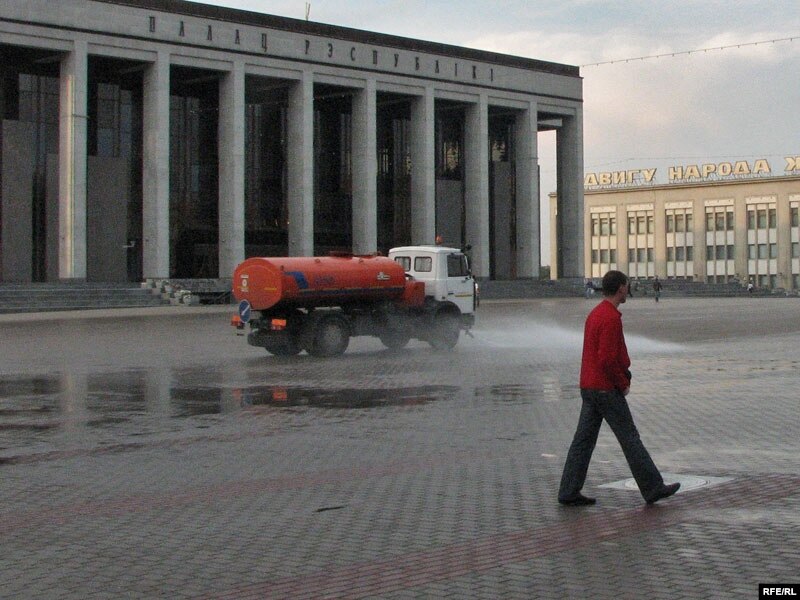 17:50 Перад пачаткам заплянаванай на 18-ю гадзіну акцыі па Кастрычніцкай плошчы езьдзіць вадавоз і палівае яе вадой. Плошча ўся залітая, але вадавоз працы не спыняе.