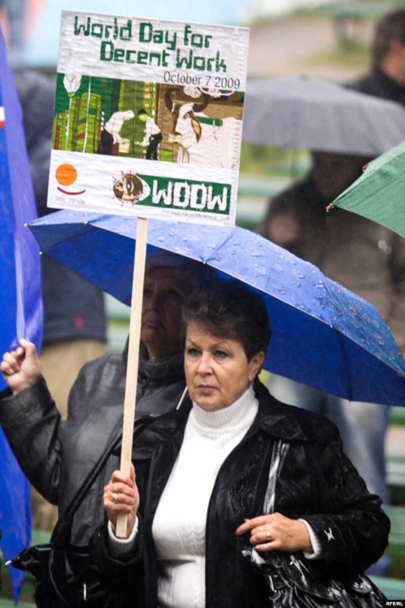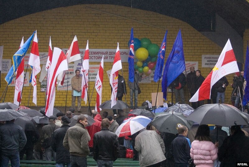 У Парк “50-годзьдзя Вялікага Кастрычніка” прыйшлі і прадстаўнікі незалежных прафсаюзаў, якія таксама падавалі заяўку на правядзеньне мітынгу. Але чыноўнікі далі дазвол толькі прадстаўнікам Беларускага Кангрэсу Дэмакратычных прафсаюзаў. Улады прапаноўвалі замест правядзеньня мітынгу ладзіць у гэты дзень маніторынг умоваў працы на беларускіх прадпрыемствах. Але тыя насталі на сваім. Нягледзячы на моцны дождж, у парку сабралася блізу 100 чалавек. Асноўнымі пытаньнямі былі занятасьць, правы, абарона і сацыяльны дыялёг.