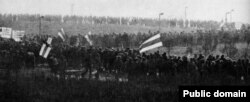 Мы павялі людзей не вакольна, па вуліцах Каліноўскага ды Сядых, а па пустым касагоры, наўпрост, ад Усходніх могілак, уніз, у пойму рэчкі Сьлепні і потым праз дамбу, зноў на вуліцу гораду. Гэта была амаль на кілямэтар адкрытая мясцовасьць, на якой было шмат пешаходных дарожак. Мы выбралі сярод іх такую трасу, якая зьвівалася хвалямі, як зьмяя, як стужка на ветры. Па дарожцы можна было ісьці разам чатыром-пяці чалавекам, і калі дзесяць тысячаў народу выцягнуліся ў даўжэзны ланцуг і пайшлі па касагоры гэтакім бясконцым сэрпантынам, з Крыжам, сьцягамі, харугвамі і кветкамі, пайшлі на Курапаты – відовішча ўзьнікла незабыўнае.