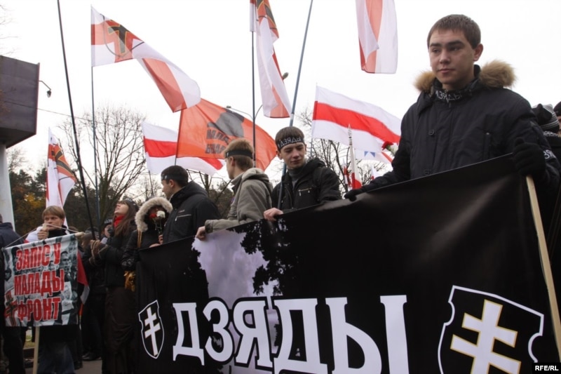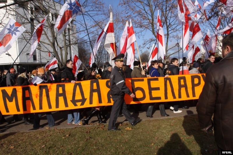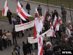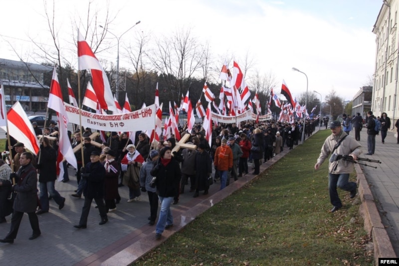 10.20 На месцы збору — два дзясяткі чалавек, пераважна моладзь. Удзельнікі акцыі трымаюць расьцяжкі “Дзяды”, “Малады фронт”, “Кансэрватыўна-хрысьціянская партыя БНФ”. Лунаюць бел-чырвона-белыя сьцягі.