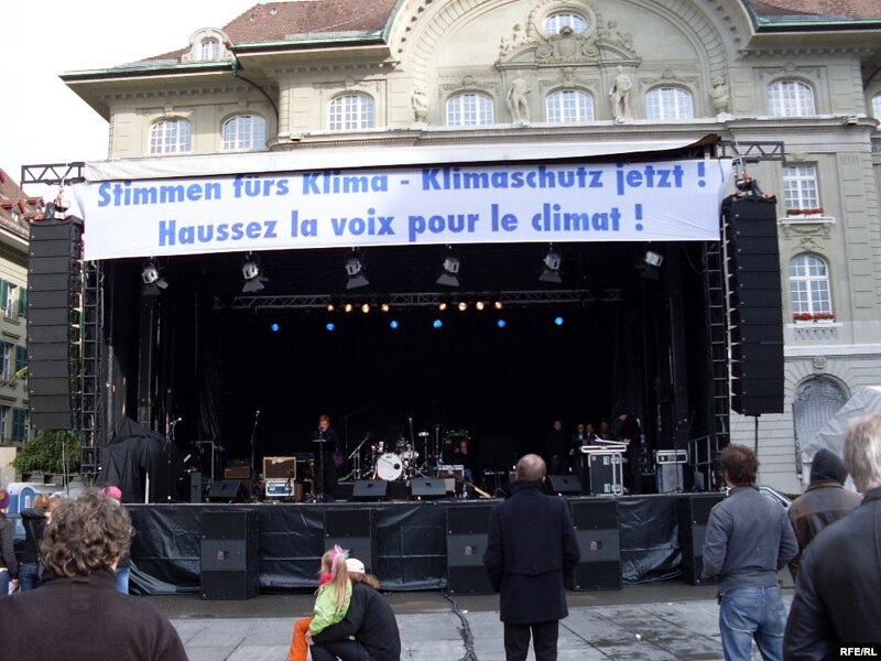 У самым цэнтры гораду, непадалёк ад будынку швэйцарскага Фэдэральнага сходу (парлямэнту), на плошчы Бундэспляц, пакрысе зьбіраюцца людзі. На 14 гадзінаў аб’яўлена акцыя па пытаньнях кліматычных зьменаў. Выступаюць грамадзкасьць і рок-музыкі. Шмат дрэнных слоў гучыць на адрас Large Hadron Collider.