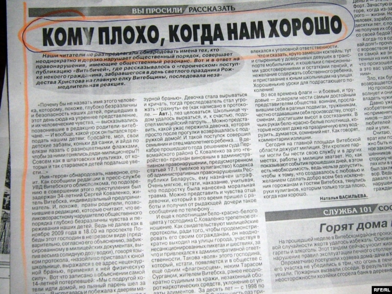 Першыя артыкулы на гэтую тэму выйшлі ў мінулы аўторак. Пра ўчынак Сяргея Каваленкі газэты распавядалі ў адным шэрагу з апісаньнямі пабітых хуліганамі ліхтароў ды паламаных платоў. Прычым імя актывіста там не называлася.