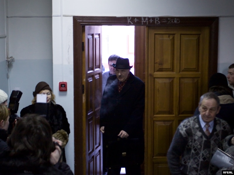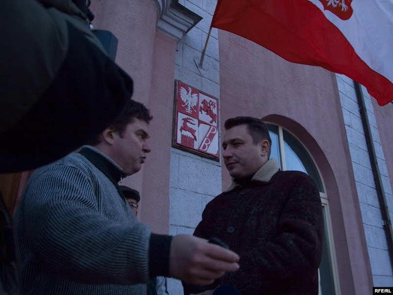 Анджэй Пачобут тлумачыць супрацоўнкам Першага нацыянальнага каналу, чаму іх не пускаюць у Польскі дом.