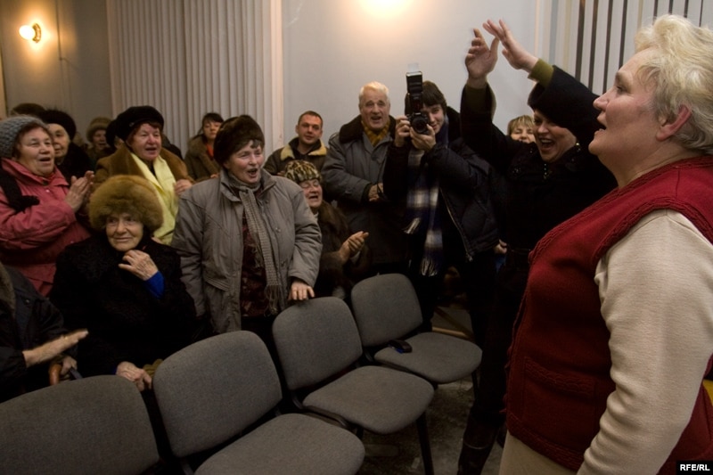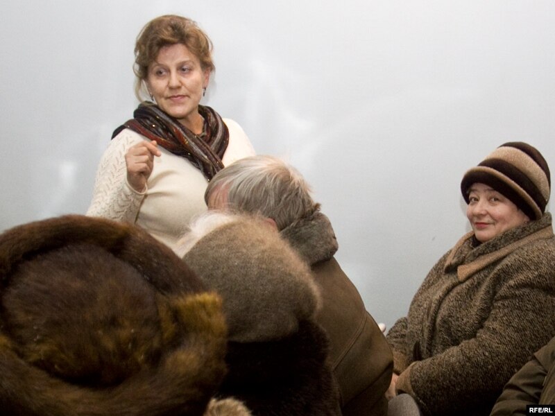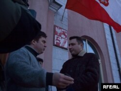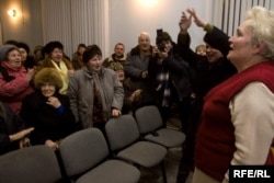 Прадстаўніца афіцыйнага саюзу заклікае ўсіх пайсьці паслухаць Станіслава Сямашку, але акрамя яе з будынку ніхто не выходзіць.
