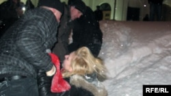 18.12 Спэцназ міліцыі накінуўся на дзяўчатаў. Міліцыянты вырываюць ва ўдзельнікаў акцыі сьцягі.