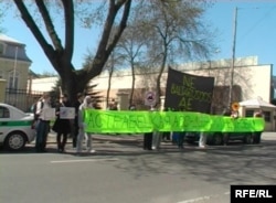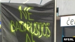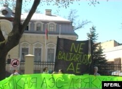 Удзельнікі акцыі каля будынку амбасады Беларусі ў Літве трымалі расьцяжкі і плякаты з надпісамі па-літоўску і па-беларуску «Не-- беларускай атамнай», «Астравецкая АЭС — дзякуй, не трэба!»