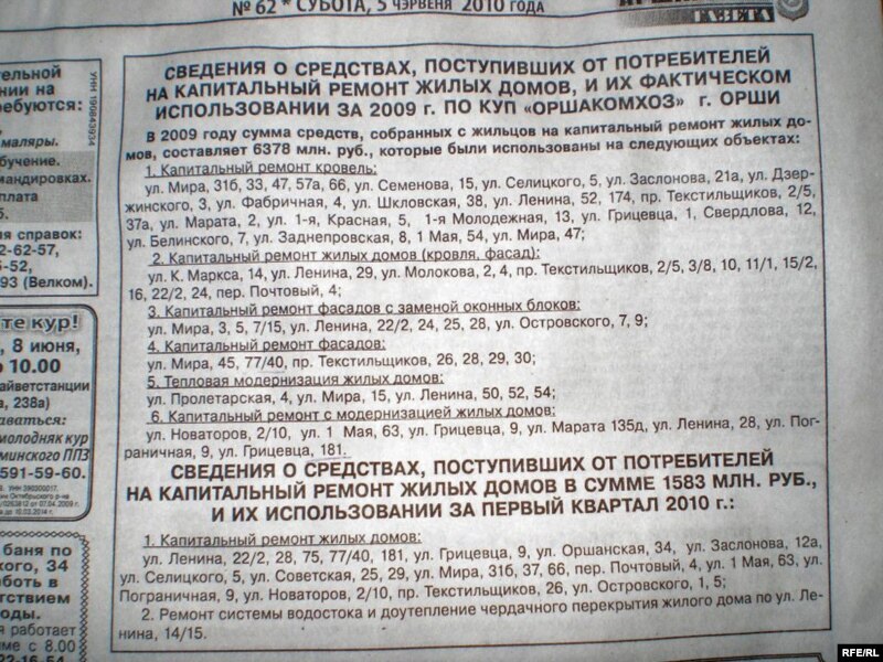 «Удалося высьветліць, што ніякіх рамонтаў — ні капітальных, ні касмэтычных — не было ў 2009 годзе ў доме 3 па вуліцы Міру, у дамах 22 і 24 па вуліцы Леніна, у дамах 7 і 9 па вуліцы Астроўскага. Дакладней, рамонты былі, але ў 2007-2008 гадах — са сродкаў, выдаткаваных на „Дажынкі“. У такой сытуацыі даводзіцца прызнаць, што тыя грошы, якія аршанцы плацяць за капітальны рамонт, выдаткоўваюцца абсалютна бескантрольна і няма ніякага дагляду за гэтымі сродкамі».