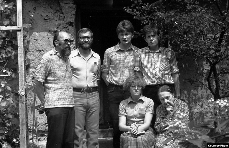 У Зоські Верас у “лясной хатцы”. Вільня, лета 1983 году. Стаяць Лявон Луцкевіч, Пётра Садоўскі, Сяргей Шупа і Сяргей Мурашка. Сядзяць Тацяна Сапач і Зоська Верас.