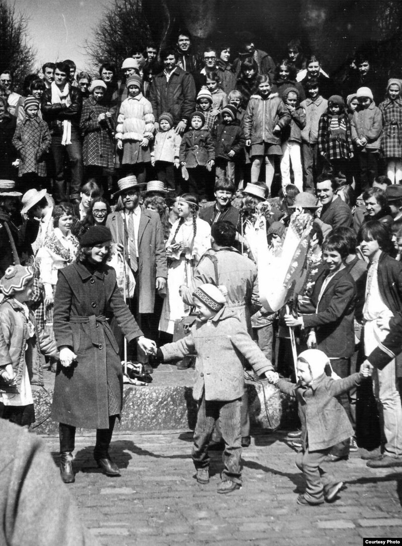 Гуканьне вясны ў Купалаўскім парку ў Менску, 1983 год. Справа налева: Янка Медзьвядзёў, Сяргей Мурашка, вуха Ігара Міклашэвіча, Сяргей Шупа, Алесь Костка, Яўген Валасевіч, Вінцук Вячорка, Алесь Істомін, аўтар.