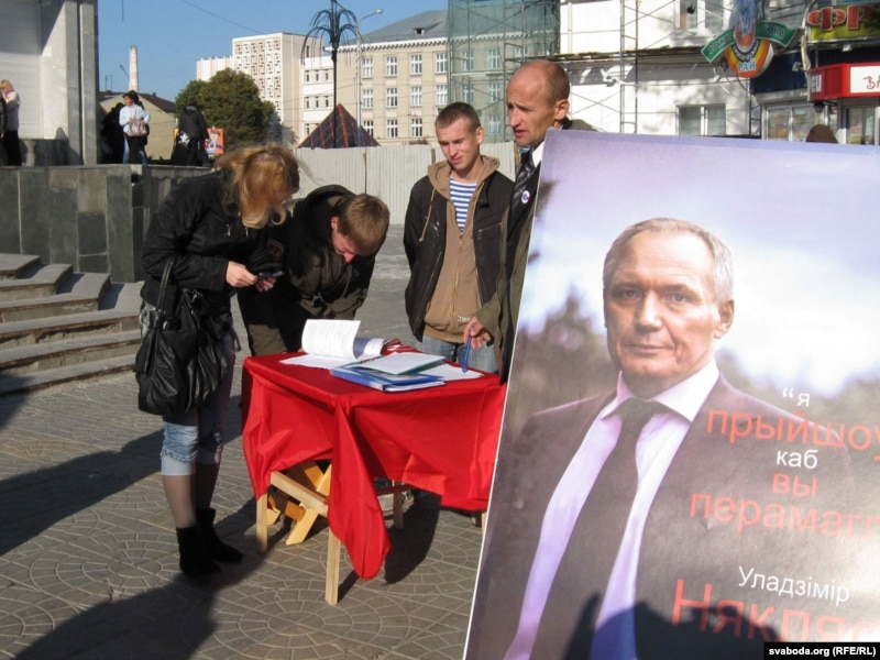 “Падышла прыгожая жанчына, шыкоўна апранутая. Ну, думаем, зараз паразмаўляем. А яна адразу: “Ці можна ў вас узяць пачытаць пра Някляева, яго праграму?” Мы адказваем, што ня можам парушаць закон, ня маем права агітаваць, даваць нешта ў рукі. Яна з роспаччу-ня роспаччу кажа: “Эх, не атрымалася”. Яна прызналася, што прыйшла ўзяць агітацыйны матэрыял і зь ім сысьці, каб быў доказ таго, што мы вялі агітацыю. Гэта, хутчэй за ўсё, супрацоўніца нейкай адміністрацыі ці нечага такога. Магчыма, ім паабяцалі прэмію ці нейкі бонус. Ну, яны й ходзяць, падбухторваць на правакацыю”.