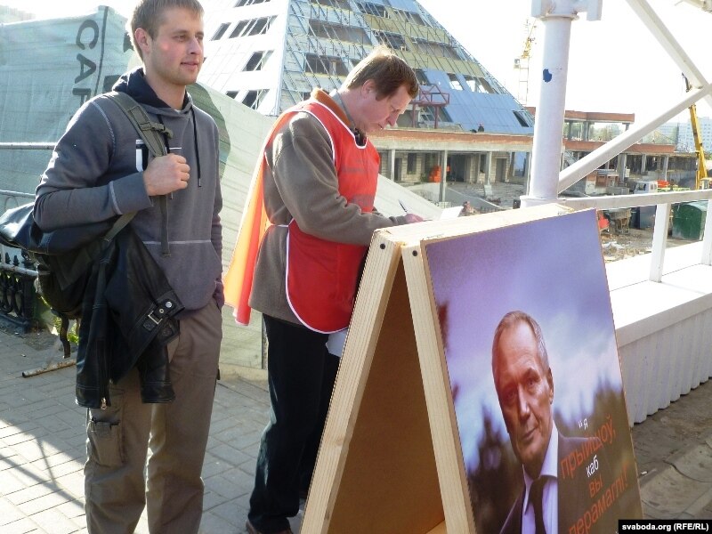 За іншых вылучэнцаў з дэмакратычнага асяродзьдзя подпісы зьбіраюць на другім баку вуліцы. На некаторых пікетах нават чытаюць вершы, як, да прыкладу, зьбіральнік подпісаў Аляксей Гаўруцікаў: