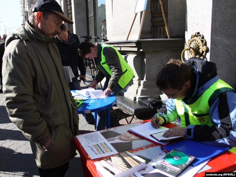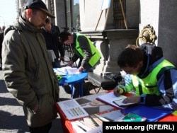 Арганізатары сёньняшняй акцыі — актывісты Аб’яднанай грамадзянскай партыі, намесьнікам старшыні якой зьяўляецца Яраслаў Раманчук. Для прыхільнікаў свайго кандыдата яны падрыхтавалі сюрпрыз: за кожны дзясяты подпіс уручалі брашуру-цытатнік «АЛ супраць АЛ» з аўтографам Анатоля Лябедзькі, за кожны дваццаты — дыск зь фільмам і аўтографам Юрыя Хашчавацкага, за кожны трыццаты — кнігу з аўтографам яе аўтара Яраслава Раманчука.