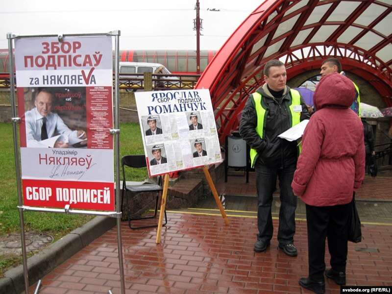 У зьбіральнікаў подпісаў за Ўладзімера Някляева інфармацыя на дзьвюх мовах. Самі яны пераважна размаўляюць па-беларуску, запісваюць — на той мове на якой жадаюць выбарцы. А вось адна спадарыня ўвесь час агітуе па-расейску. Пытаюся — чаму?