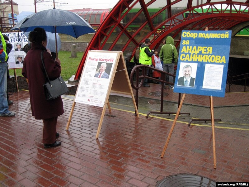 Па-над пікетам вылучэнца на прэзыдэнцтва ад партыі БНФ Рыгора Кастусёва лунае бел-чырвона-белы сьцяг. На стэндзе — біяграфія прэтэндэнта на тарашкевіцы. У фронтаўскага актывіста Віталя Макаранкі пытаюся, на якой мове ён гаворыць з падпісантамі: