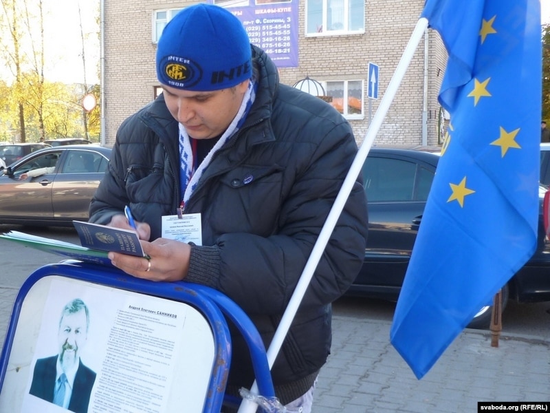 Зьбіральнік подпісаў за Андрэя Саньнікава ў Лідзе, Уладзімер Круцікаў, кажа, што ў іх няма сымболікі, бо на гэта папросту, напэўна, не хапіла сродкаў. Але, зь яго слоў, людзі і так добра падыходзяць да іхніх пікетаў і пакідаюць свае подпісы.